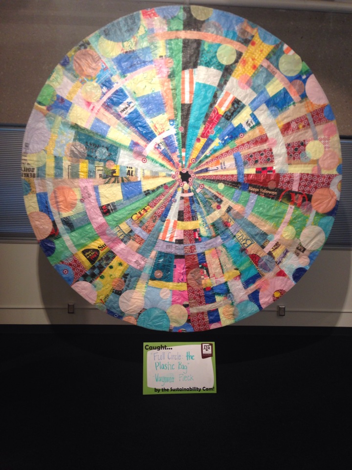 Today in particular we went to campus to help some students out with a sustainable initiative but ended up not being able to help out. But with our “Sustain-a- Army” “Sustain-a-Buddies” “Sustain-a-family” we always seem to find something else sustainable on campus. Today we found an exhibit with all of the art made completely out of plastic bags.