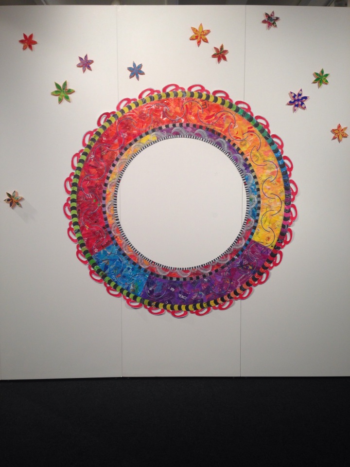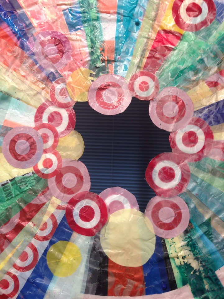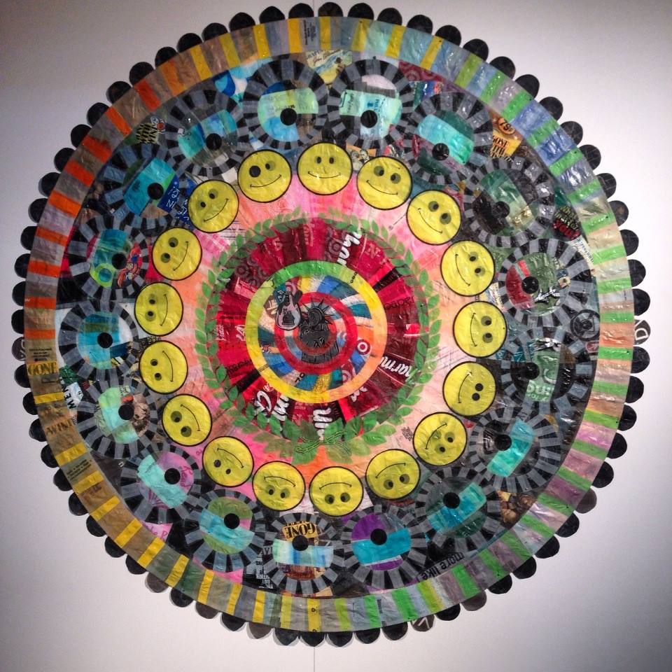 Austin visual artist Virginia Fleck’s critique of what she calls “our consumerist society,” presented in a series of circular mandalas created from plastic shopping bags and product packaging material